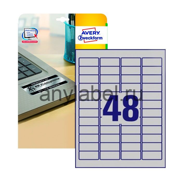 » Серебристые самоклеящиеся этикетки А4 Avery Zweckform, Mega label » L6009-100 Этикетки самоклеящиеся Avery Zweckform из серебристой пленки 45.7х21.2 мм (48 штук на листе, 100 листов)